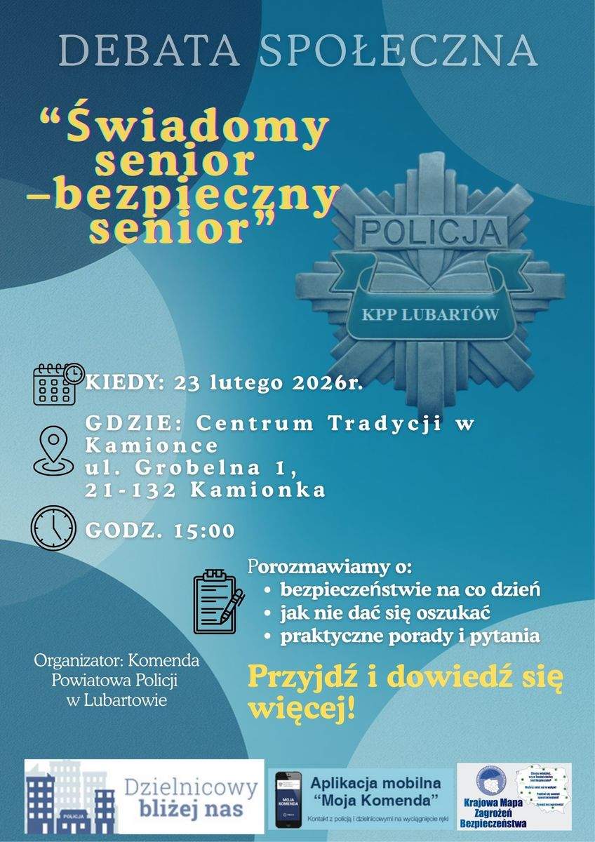 23 lutego 2026 roku w budynku Centrum Tradycji w Kamionce (ulica Grobelna 1) odbędzie się debata społeczna pod nazwą "Świadomy senior - bezpieczny senior". Spotkanie rozpocznie się o godzinie 15:00.
